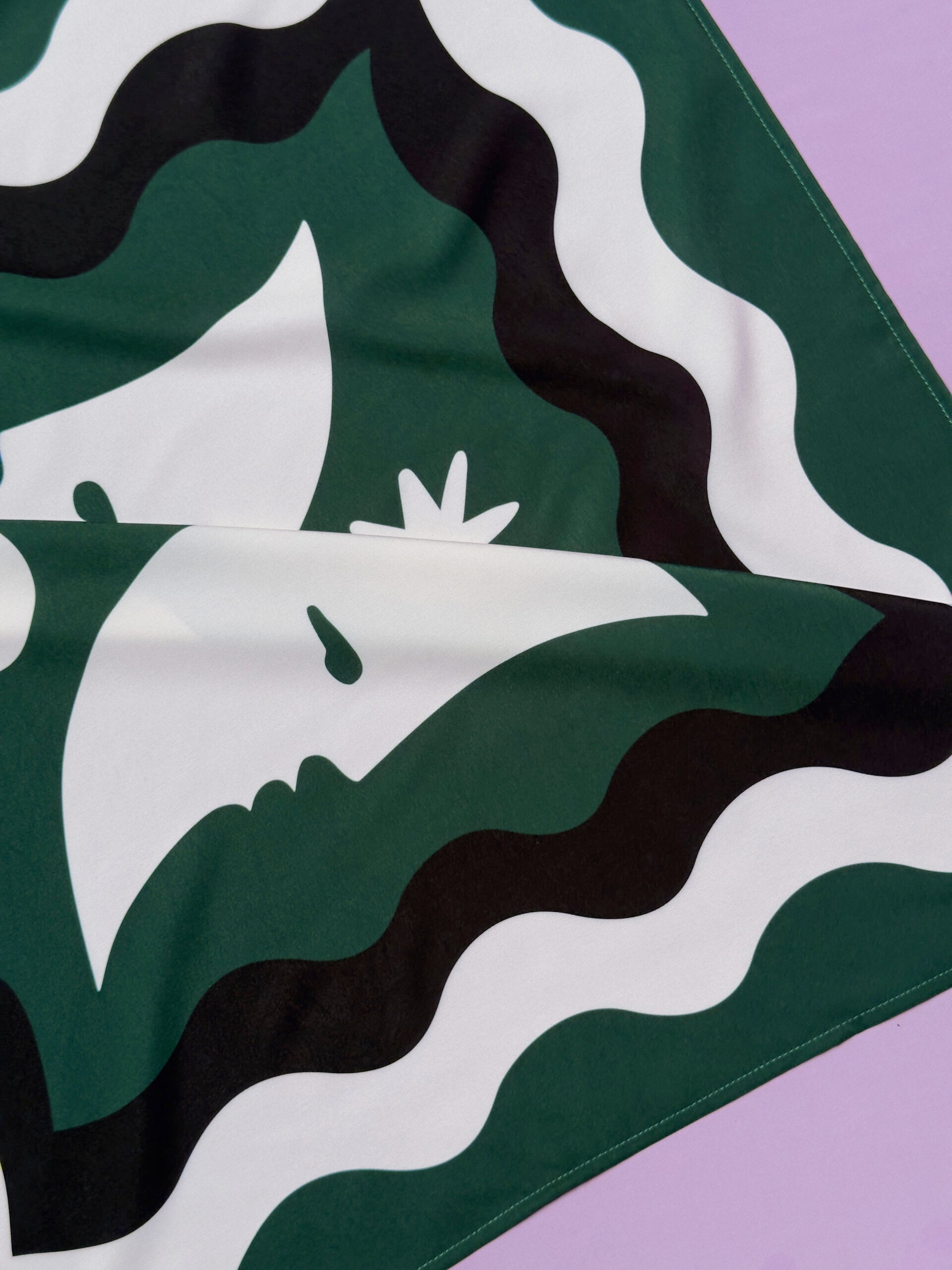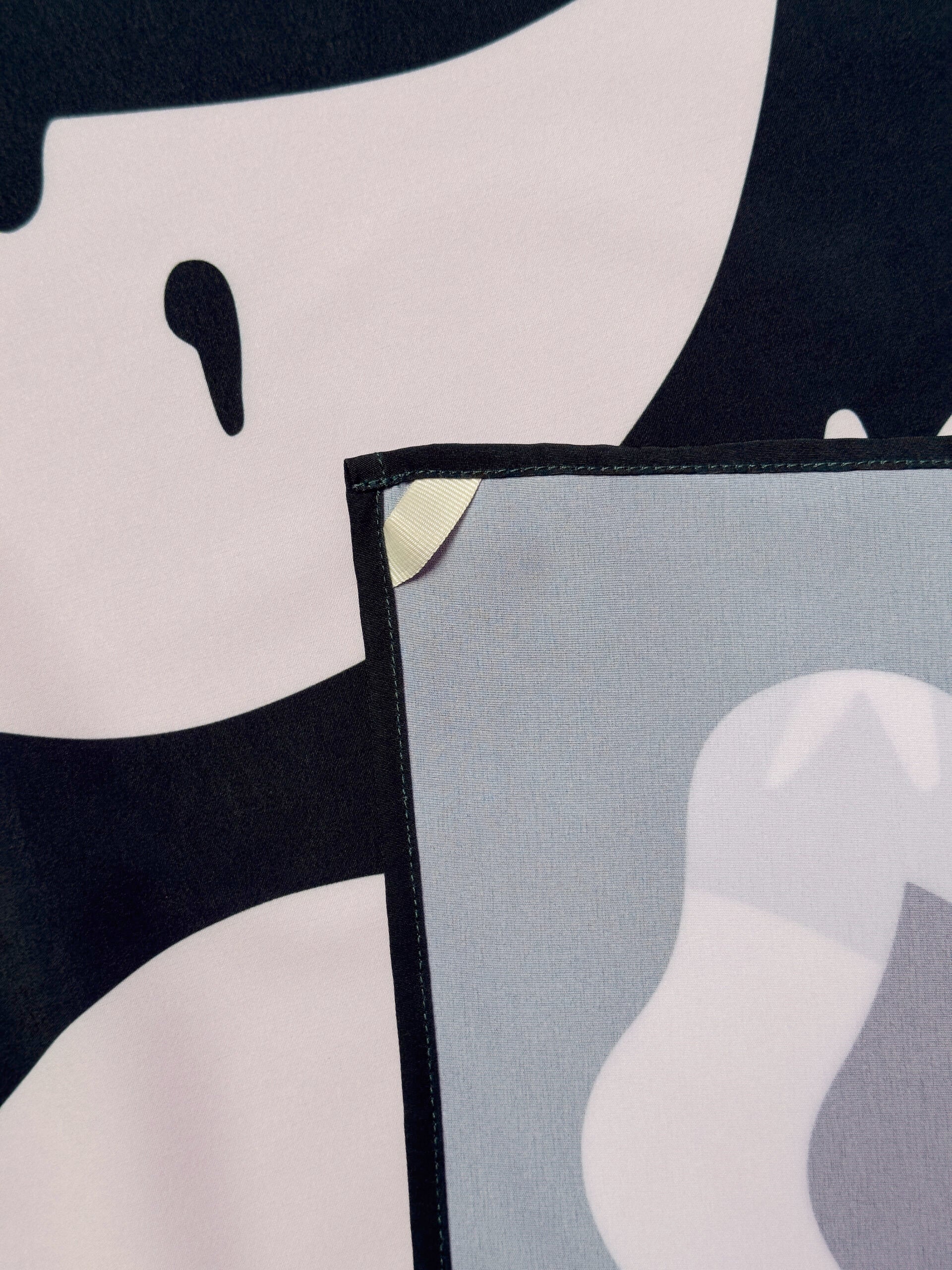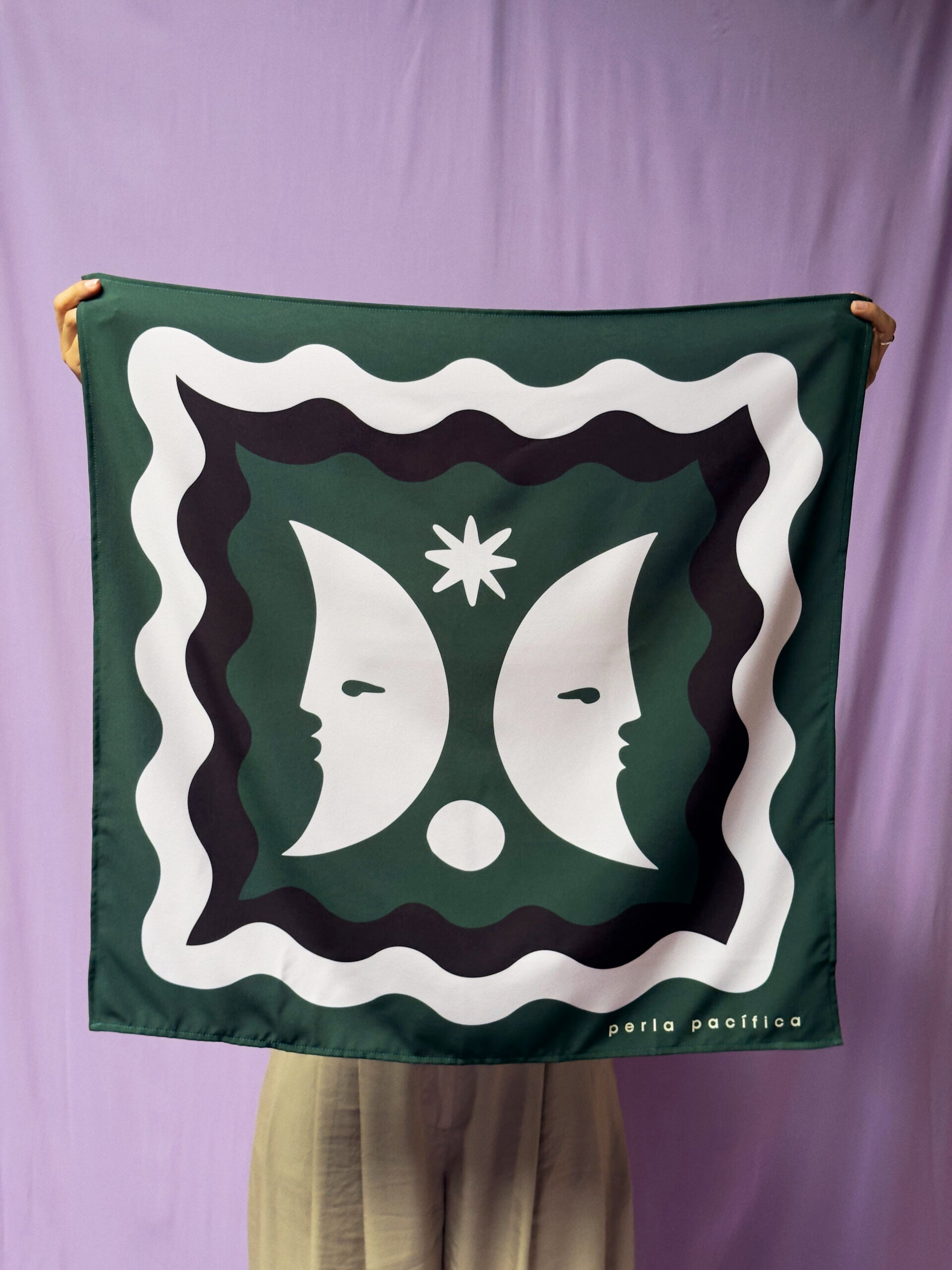 Pañuelos con ilustraciones pensadas para ser obras de arte que se pueden usar como accesorio o elemento decorativo para el hogar. Tiene en sus esquinas, en la parte interna unos pequeños ojales para colgarlo con clavos o ayudarse para sus distintos usos.