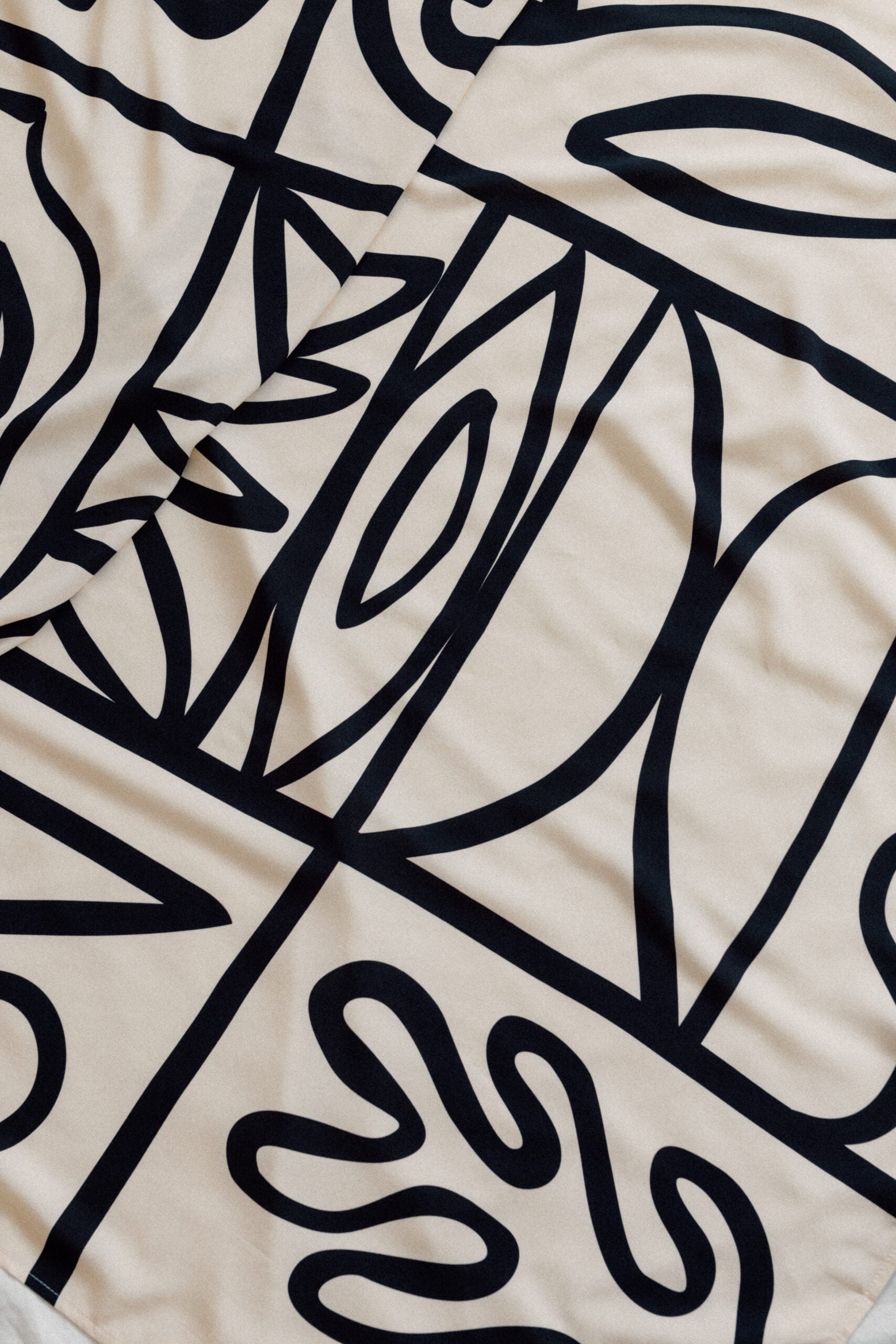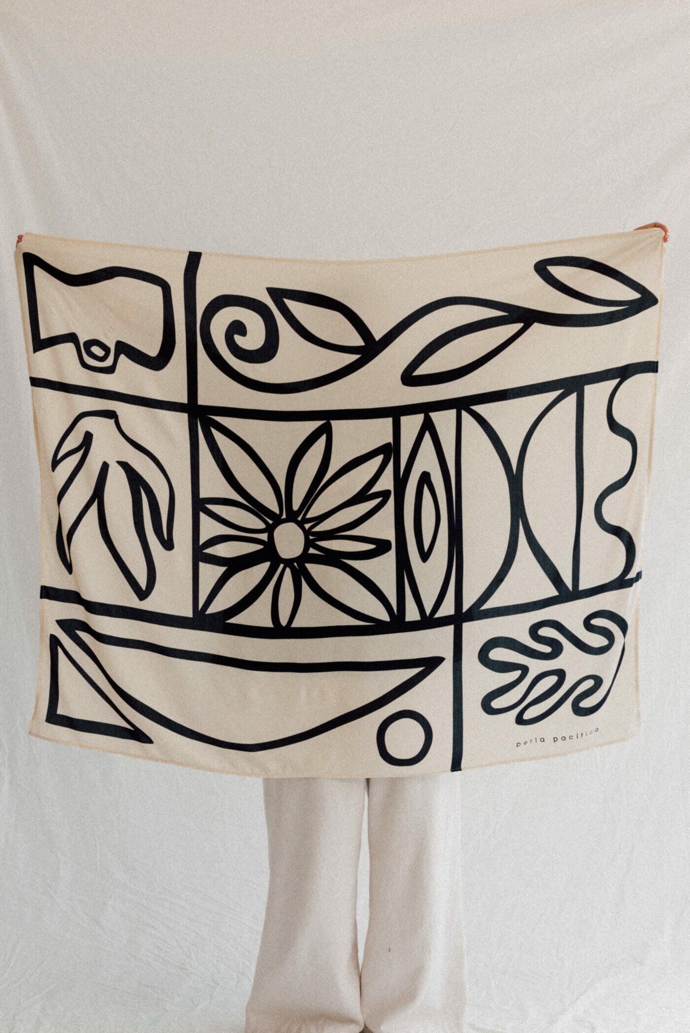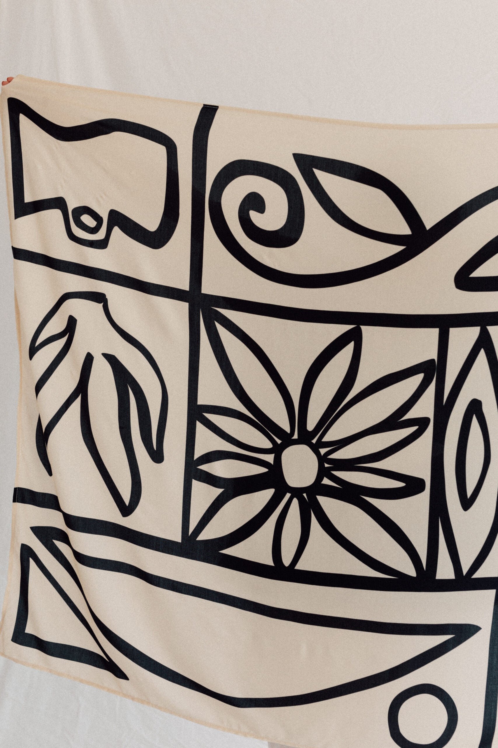 Pañuelos con ilustraciones pensadas para ser obras de arte que se pueden usar como accesorio o elemento decorativo para el hogar. Tiene en sus esquinas, en la parte interna unos pequeños ojales para colgarlo con clavos o ayudarse para sus distintos usos.