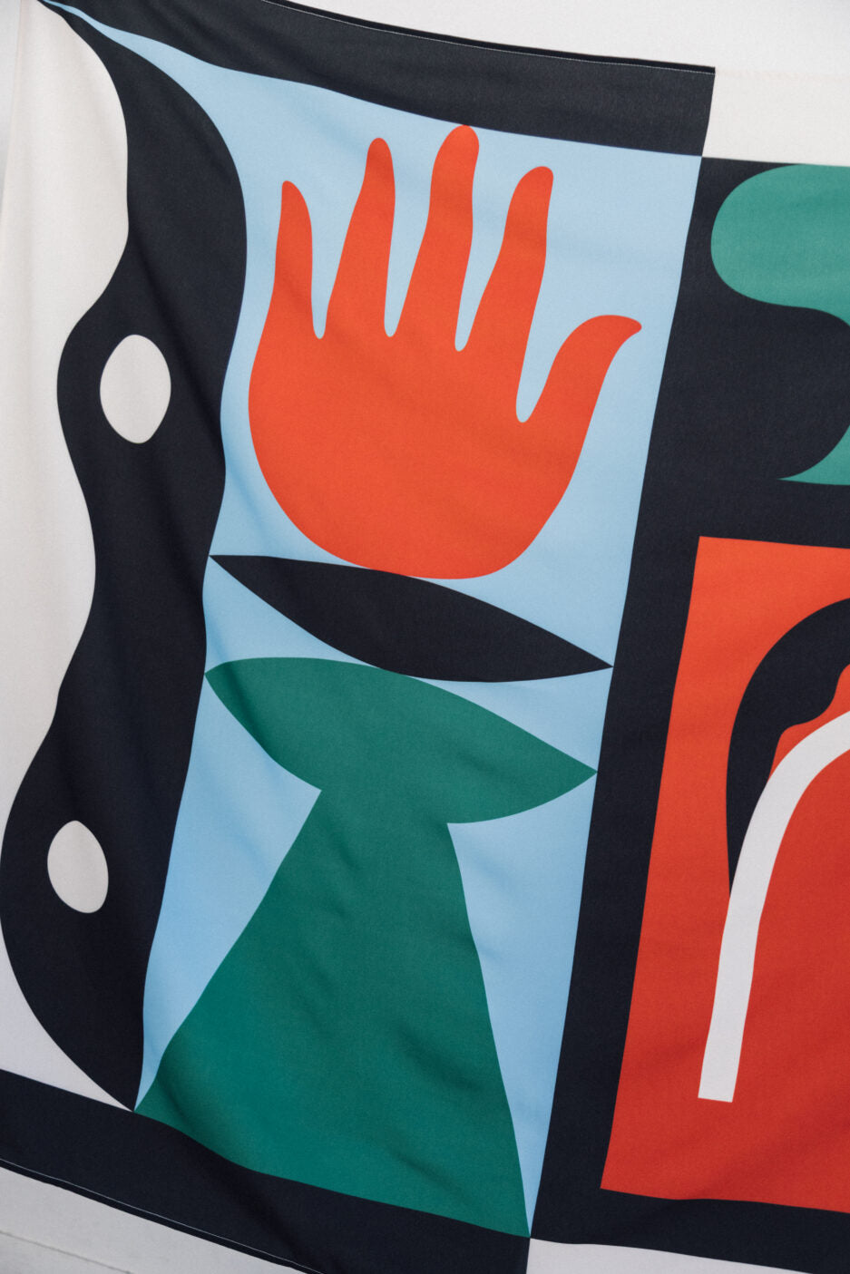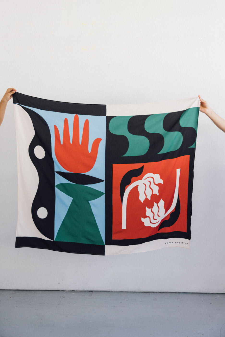 Pañuelos con ilustraciones pensadas para ser obras de arte que se pueden usar como accesorio o elemento decoraticvo para el hogar. Tiene en sus esquinas, en la parte interna unos pequeños ojales para colgarlo con clavos o ayudarse para sus distintos usos.