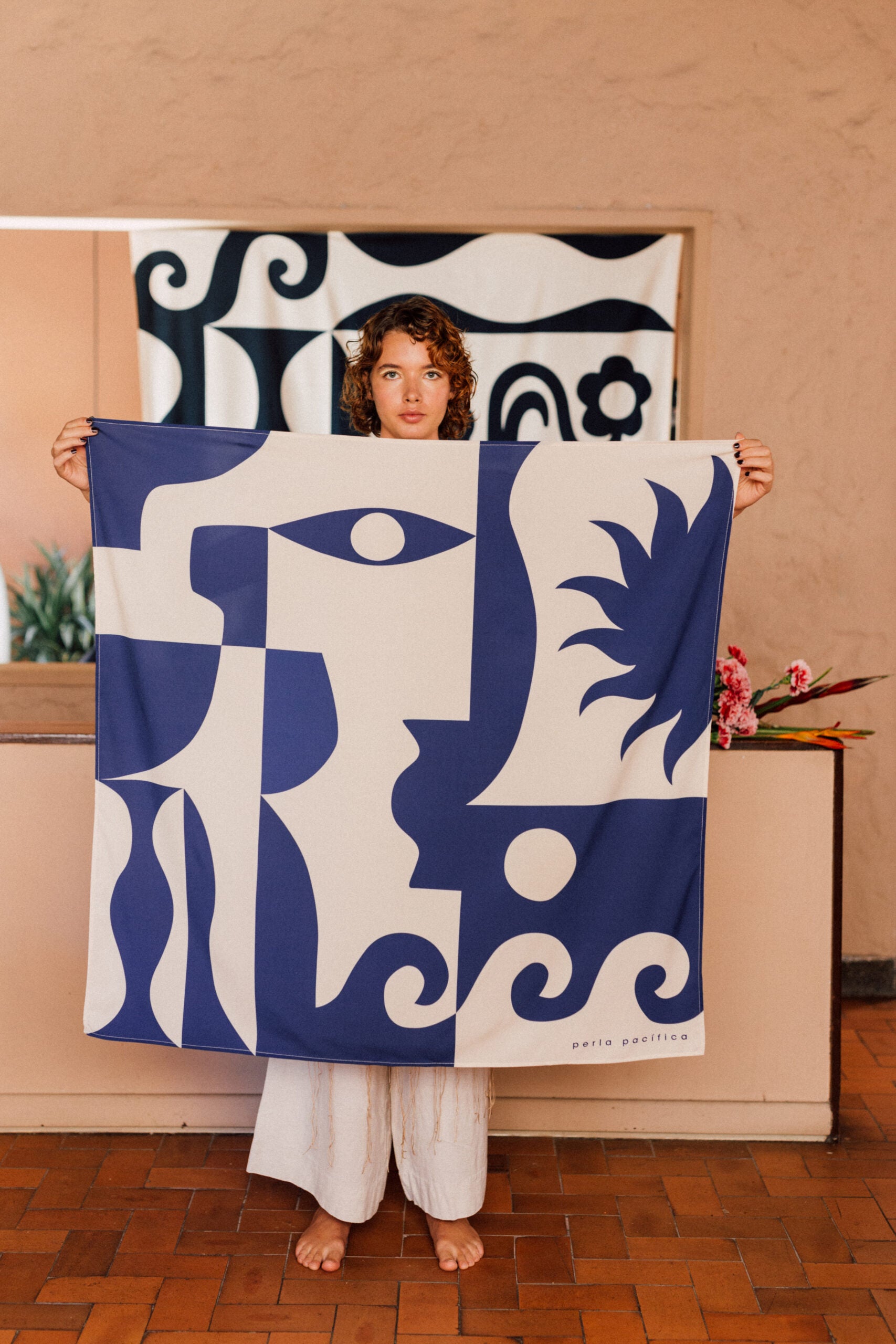 Pañuelos con ilustraciones pensadas para ser obras de arte que se pueden usar como accesorio o elemento decoraticvo para el hogar. Tiene en sus esquinas, en la parte interna unos pequeños ojales para colgarlo con clavos o ayudarse para sus distintos usos. Cada creación tiene una inspiración, esta vez fue un viaje transatlantico. Estampación ecologica com sublimación.