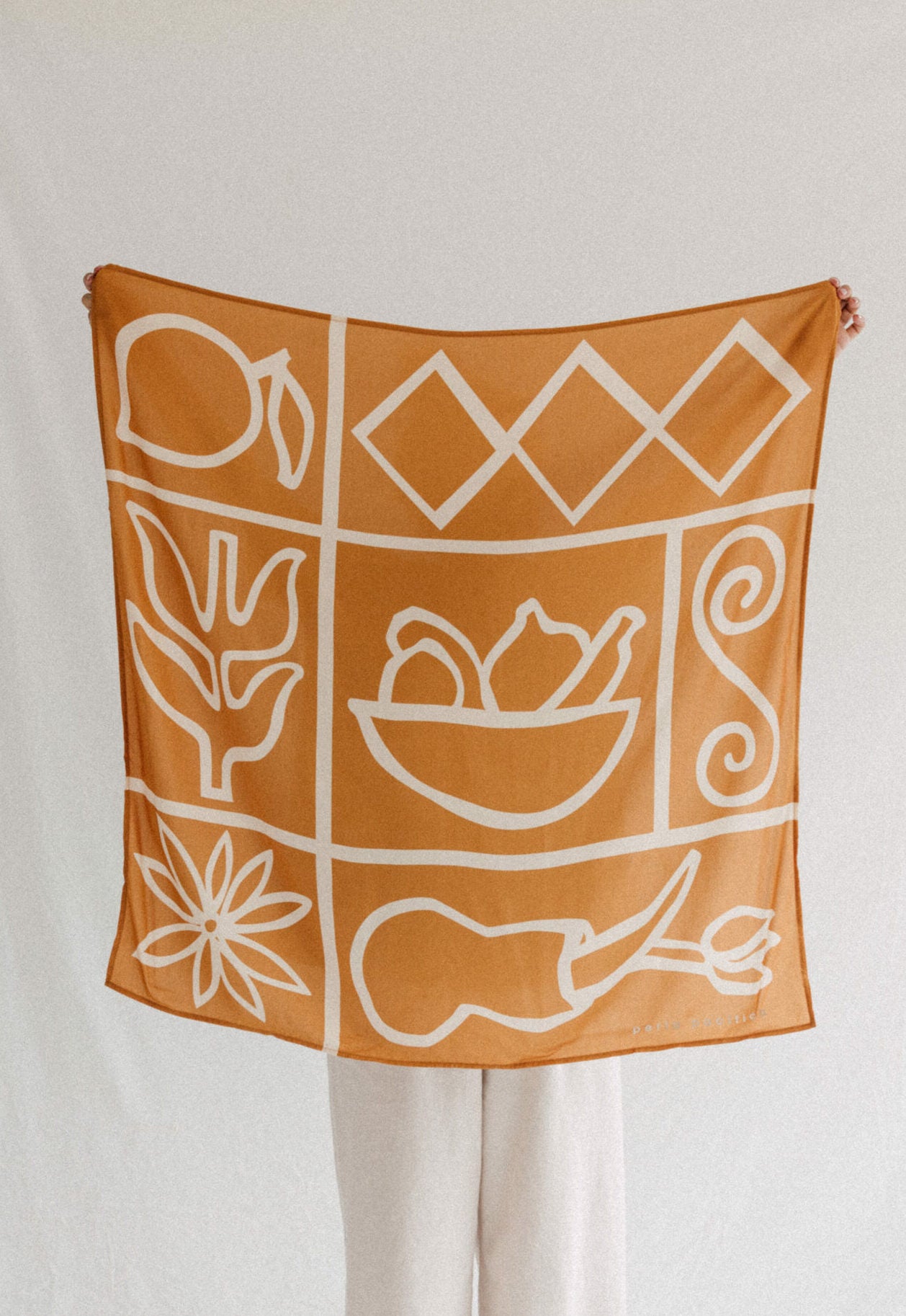 Pañuelos con ilustraciones pensadas para ser obras de arte que se pueden usar como accesorio o elemento decorativo para el hogar. Tiene en sus esquinas, en la parte interna unos pequeños ojales para colgarlo con clavos o ayudarse para sus distintos usos.