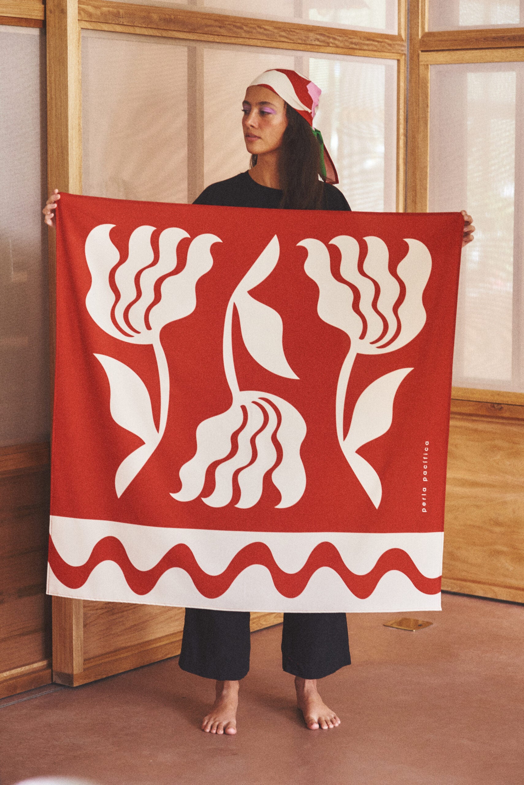 Pañuelos con ilustraciones pensadas para ser obras de arte que se pueden usar como accesorio o elemento decoraticvo para el hogar. Tiene en sus esquinas, en la parte interna unos pequeños ojales para colgarlo con clavos o ayudarse para sus distintos usos. Cada creación tiene una inspiración, esta vez fueron los multiples orígenes. Estampación ecologica com sublimación.