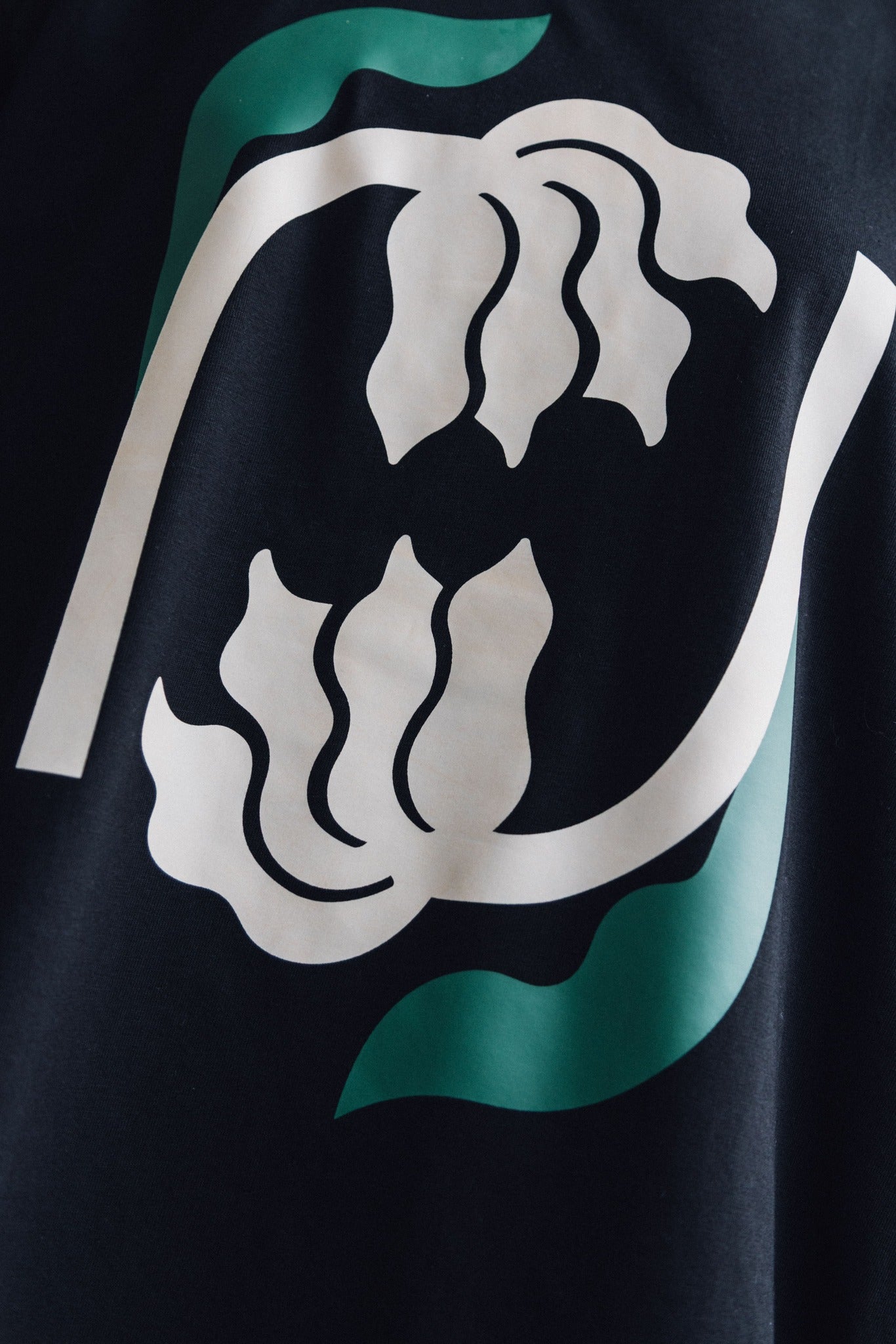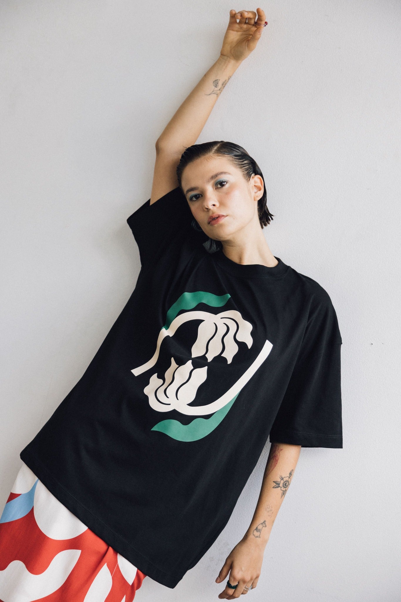 T-shirt Oversize Danza de Iris + Falda Hibiscus en una propuesta versátil que puede usarse como conjunto o por separado.