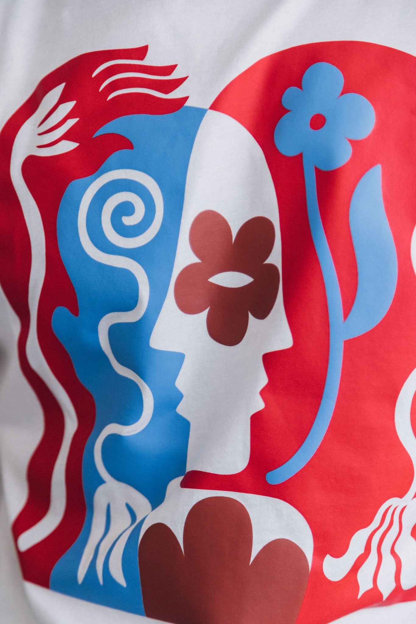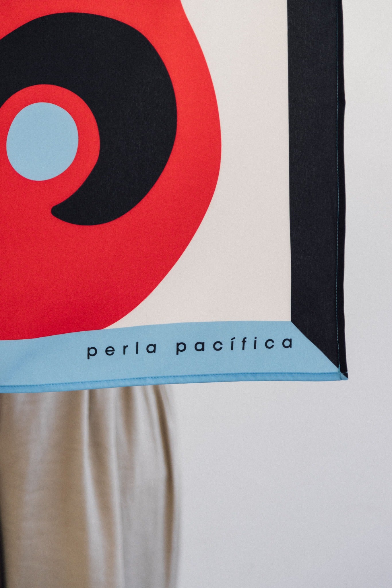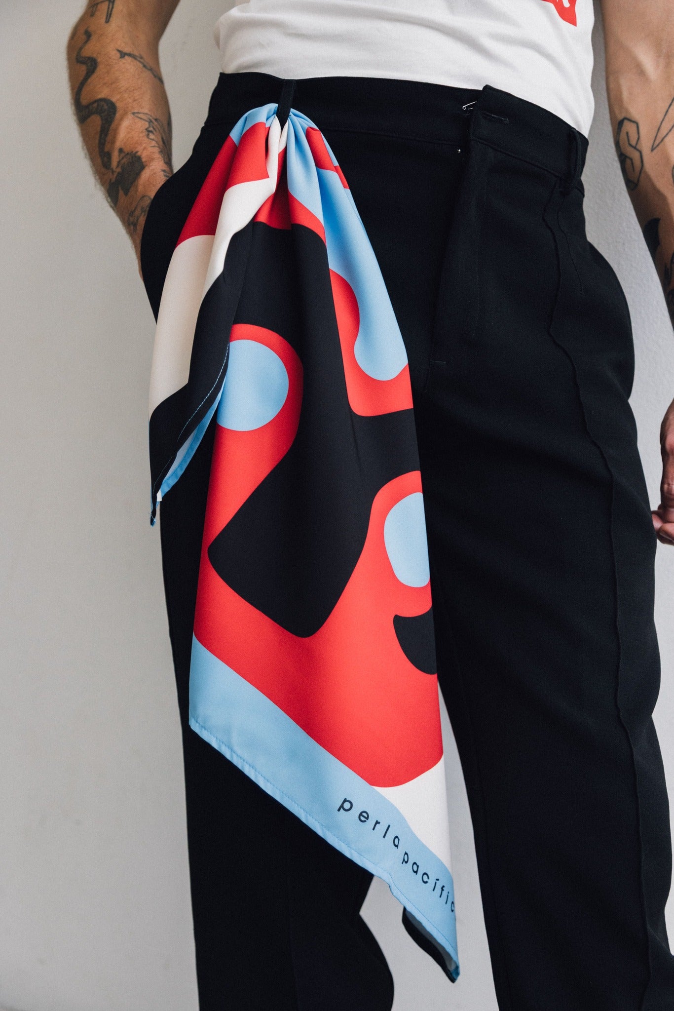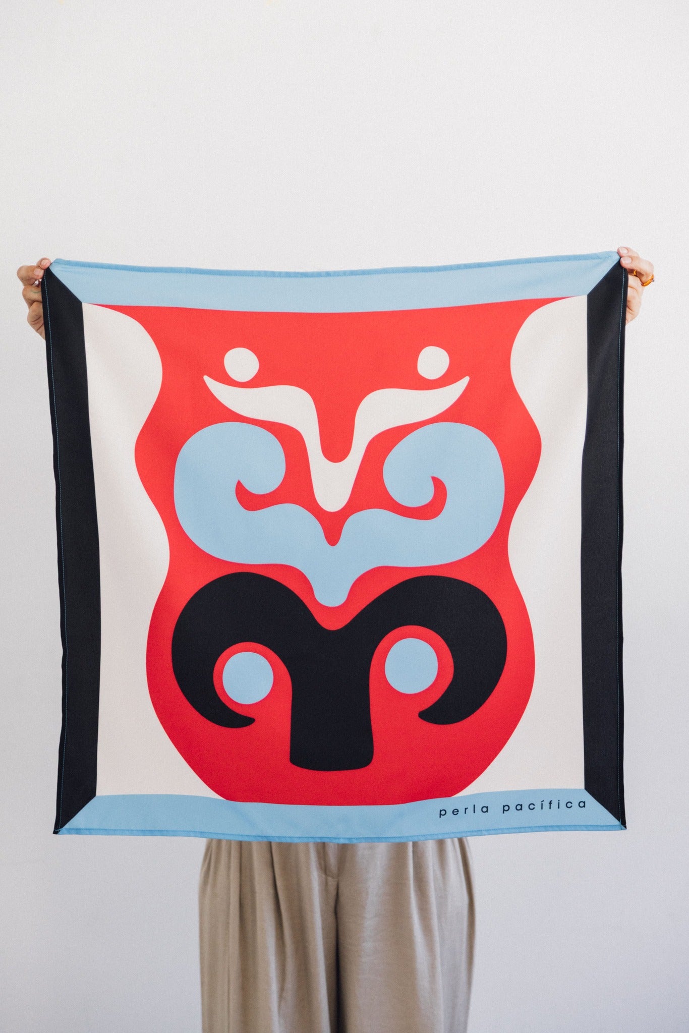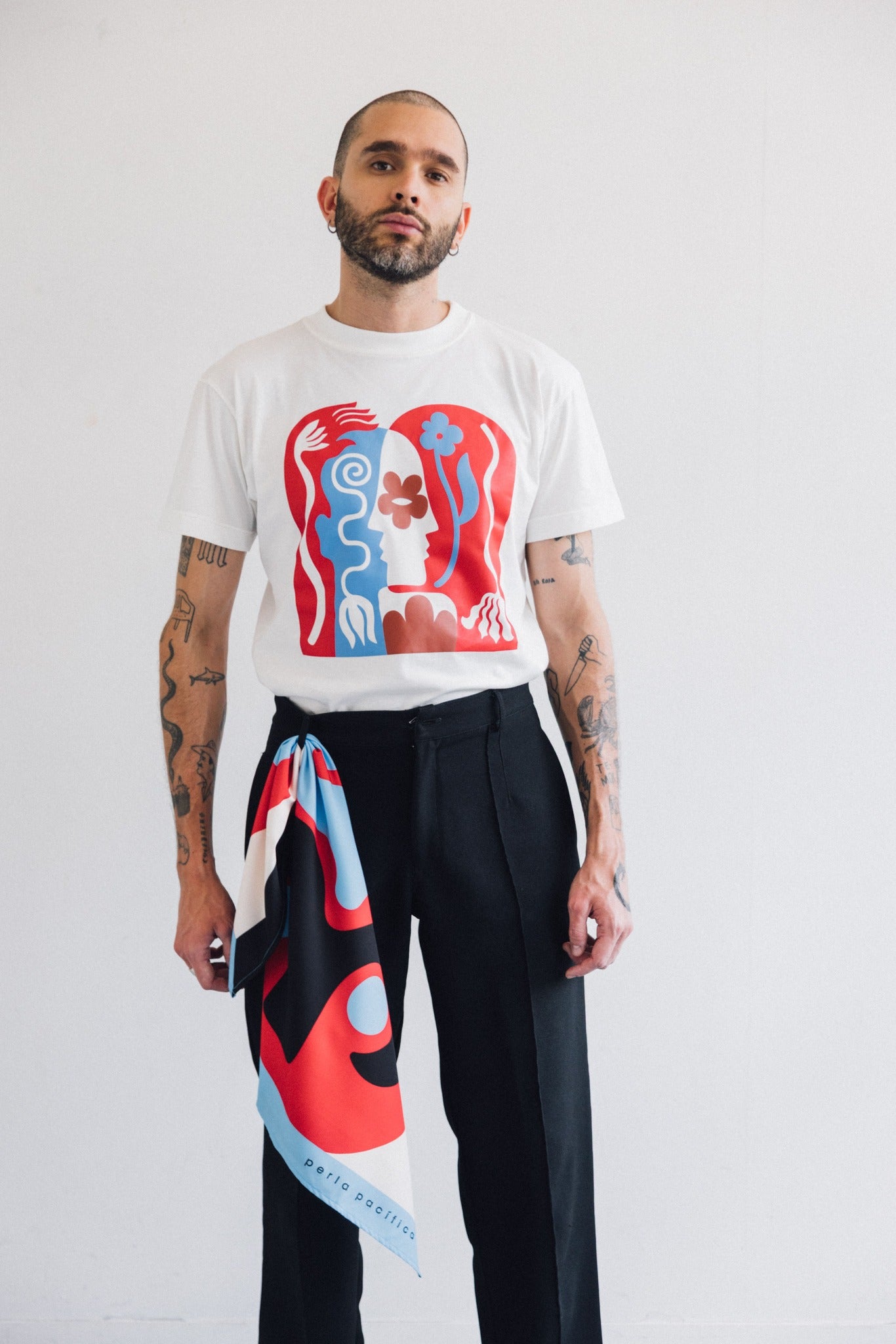 Ambas piezas nacen de la colección Ritual y comparten el concepto de florecimiento a través de ilustraciones originales de Perla Pacífica. Estampación screen con plastisol en la T-shirt y estampación ecológica con sublimación en la bandana.