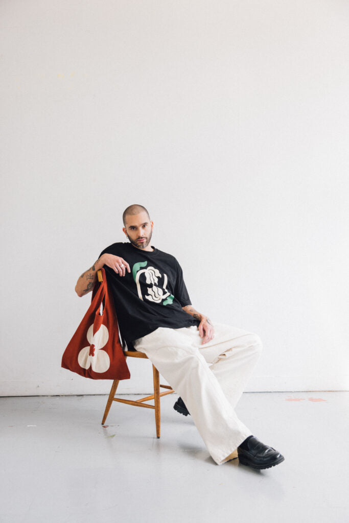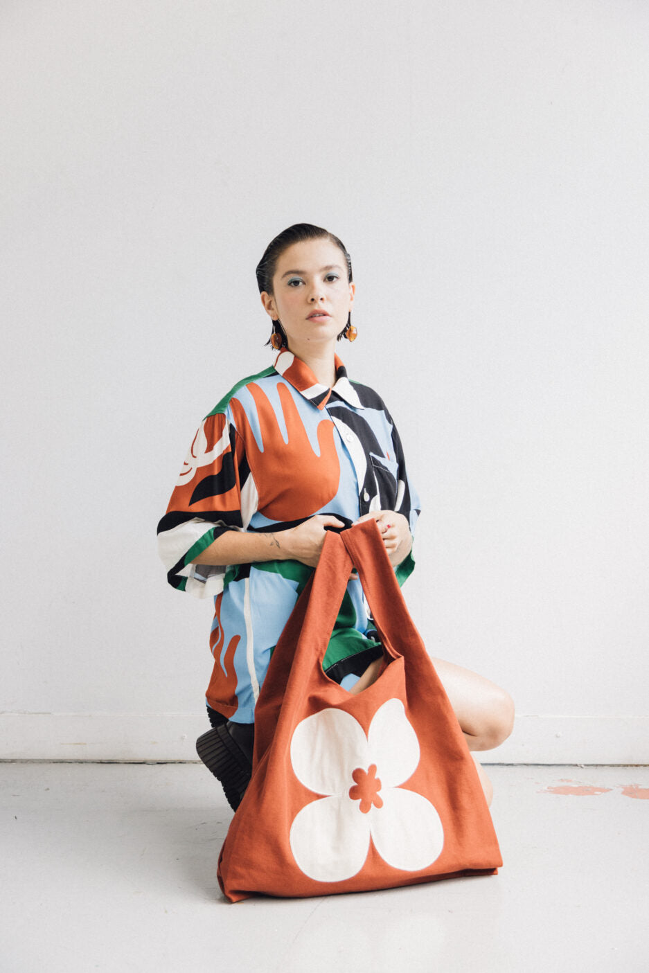 Cada creación tiene una inspiración, esta vez fue un ritual de florecimiento. En el frente la flor es hecha con patchwork y bordada en el contorno.