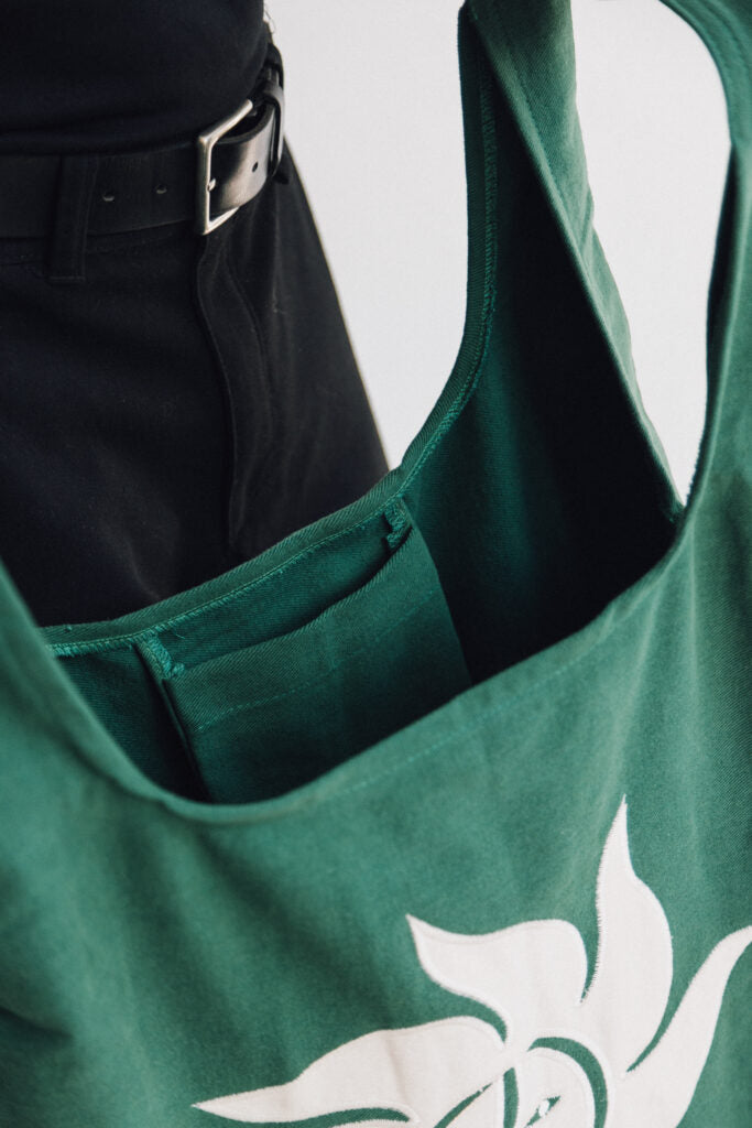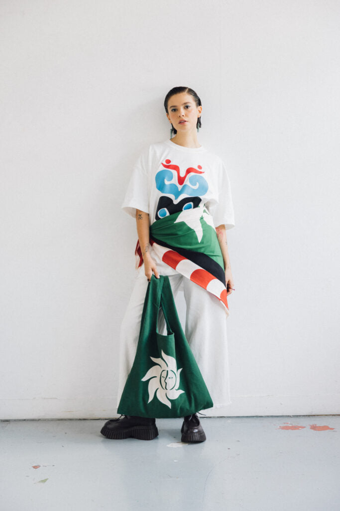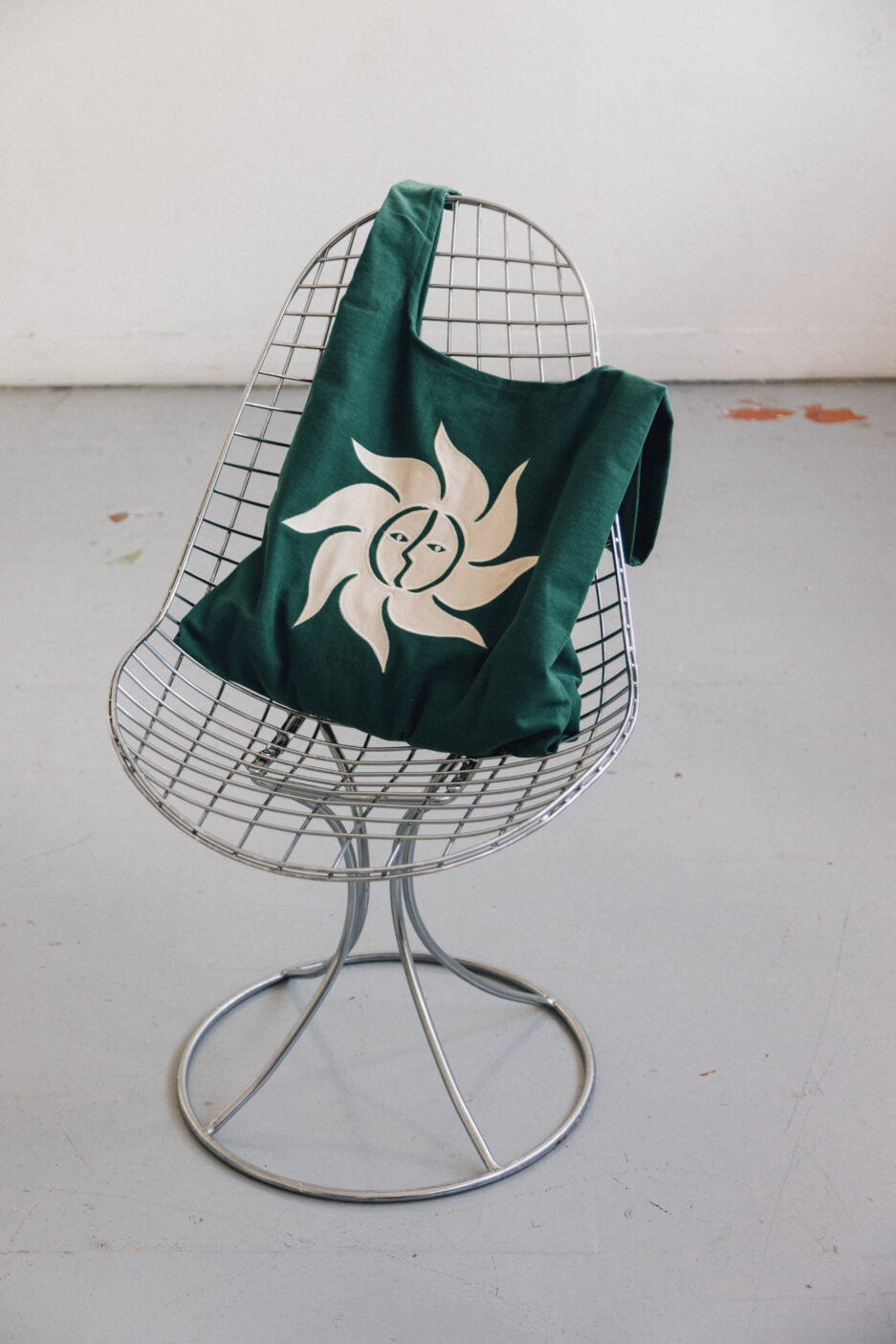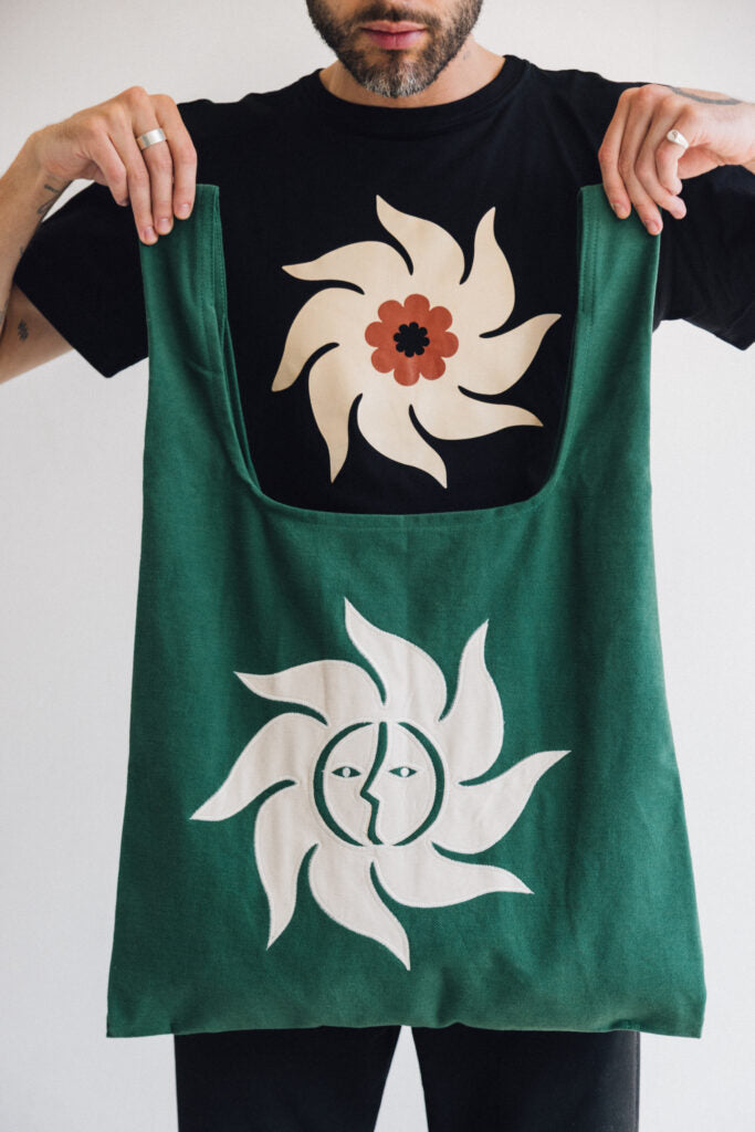 Cada creación tiene una inspiración, esta vez fue un ritual de florecimiento. En el frente el sol es hecho con patchwork y bordado en el contorno.